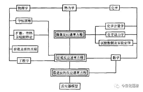 數學模型可以分為兩大類,一類是從過程機理出發推導得到的,這一類模型叫做機理模型;另一類是由于對過程的實質了解得不甚確切,而是從實驗數據歸納得到的模型,叫做經驗模型。機理模型由于反映了過程的本質,可以外推使用,即可超出實驗條件范圍;而經驗模型則不宜進行外推,或者不宜大幅度地進行外推。既然是經驗性的東西,自然就有一定的局限性,超過了所歸納的實驗數據范圍,結論就不一定可靠。顯而易見,能夠建立機理模型當然最好,但由于科技發展水平的限制,目前還有許多過程的實質尚不甚清楚,也只能建立經驗模型。工業反應器中的過程都是十分復雜的,需要抓住主要矛盾,將復雜現象簡化,構成一個清晰的物理圖像。一般工業化學反應器數學模型的建立,首先要結合反應器的形式,充分運用各個有關學科的知識進行過程的動力學分析。圖1-4為反應器模型建立程序,同時也示出了所涉及的學科及其相互關系。通過實驗數據以及熱力學和化學知識,首先獲得微觀反應速率方程,前已指出,要確定反應過程的溫度條件,就牽涉到相間的傳熱、反應器與外界的換熱;要確定反應器內物料的濃度分布情況,則與器內流體流動狀況、混合情況、相間傳質等有關。無論反應組分的濃度或溫度,都是決定反應速率的重要因素。因此,微觀反應速率方程是不可能描述工業反應器的全過程的。這就需要將微觀反應速率方程與傳遞過程結合起來考慮,運用相應的數學方法,建立宏觀反應速率方程。最后,還需從經濟的角度進行分析,以獲得最適宜的反應速率方程。