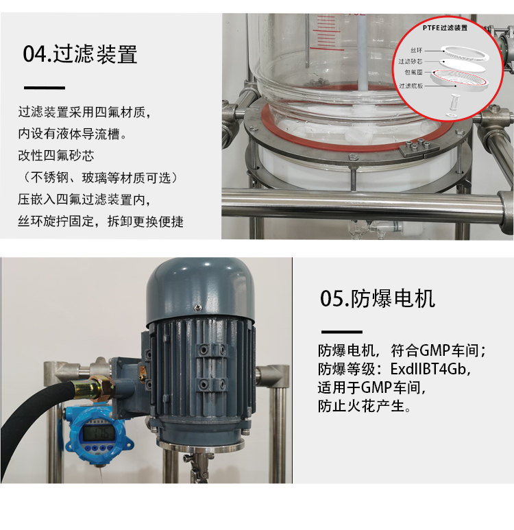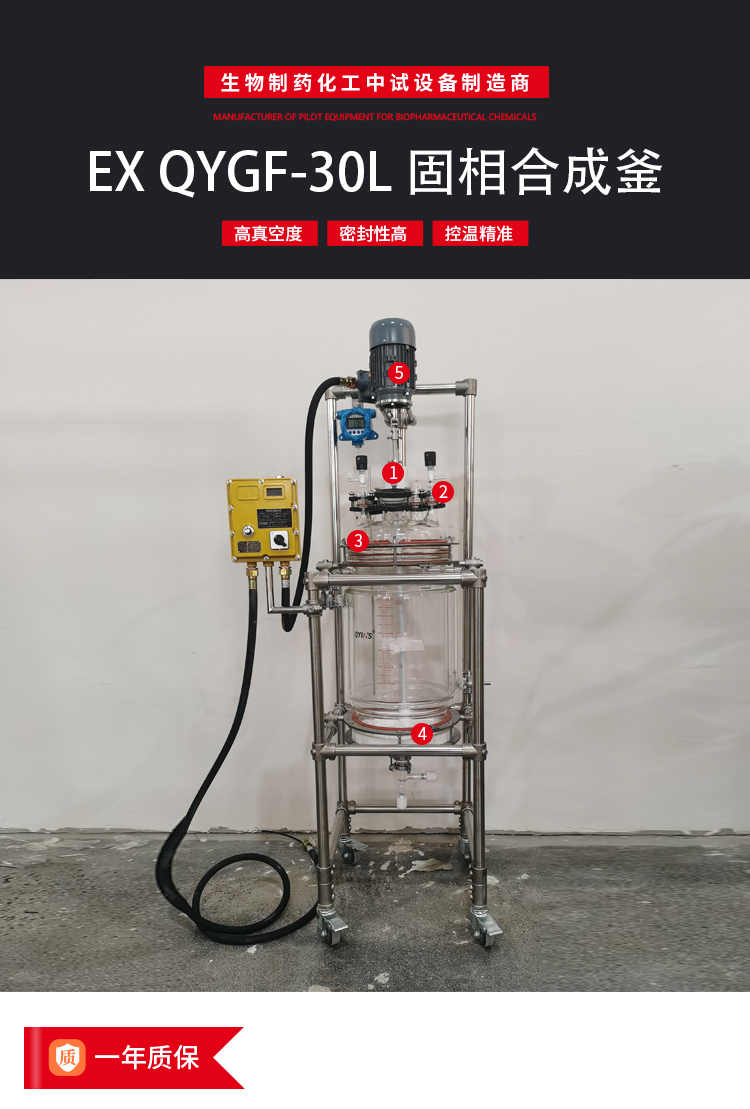 固相合成反應釜,可實現合成裂解固液分離過濾以及結晶等工藝要求,可與常規反應裝置輕松組合。使用適當的過濾器分離漿液中的固體顆粒,形成成濾餅;濾液向下流動,從底部出口的閥門流出,過濾板多種材質,多種孔徑可選